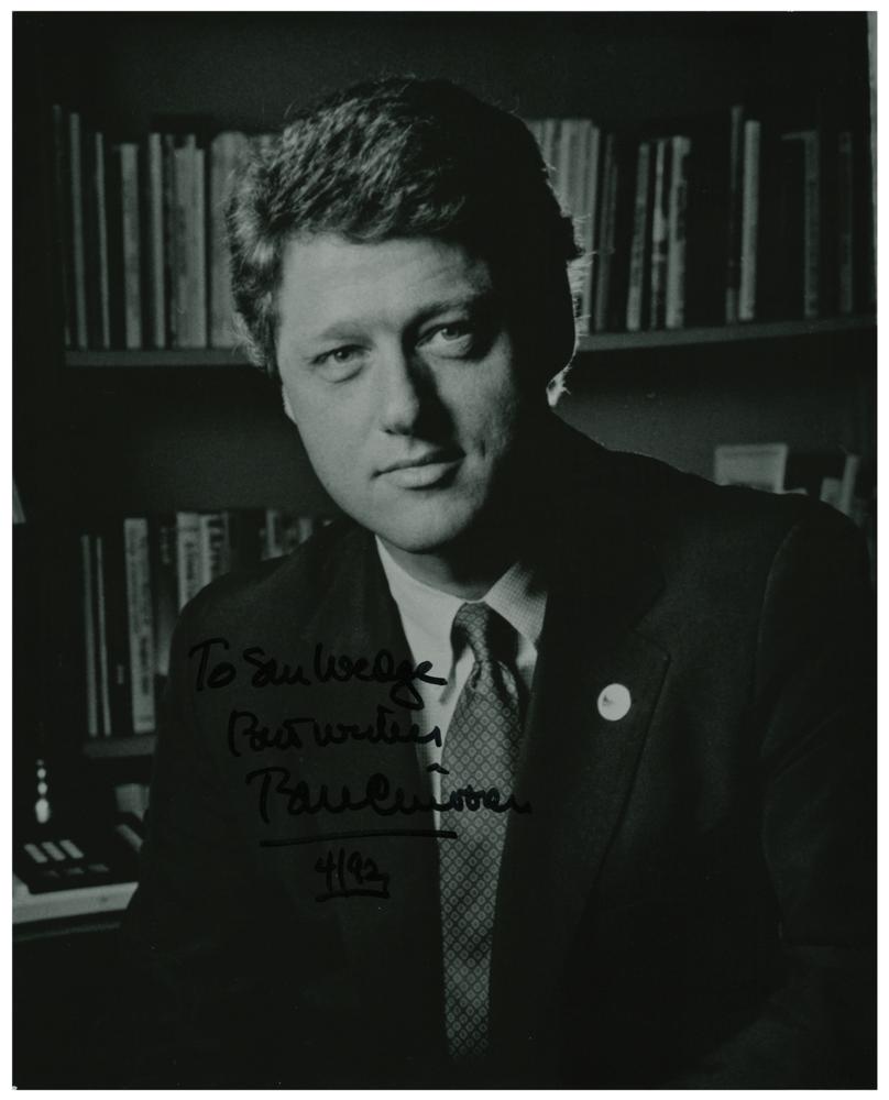 Glossy 8 x 10 photo of Clinton, signed and inscribed in black felt tip while on the campaign trail, "To Sam Wedge, Best wishes, Bill Clinton, 4/92.” In fine condition.