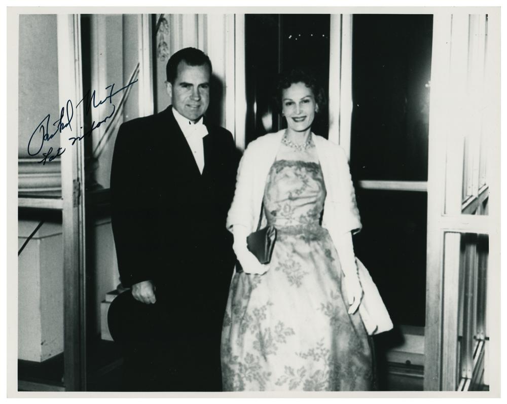 Glossy 10 x 8 photo of Richard Nixon and Pat Nixon together in formalwear, signed in black felt tip by both. In fine condition.