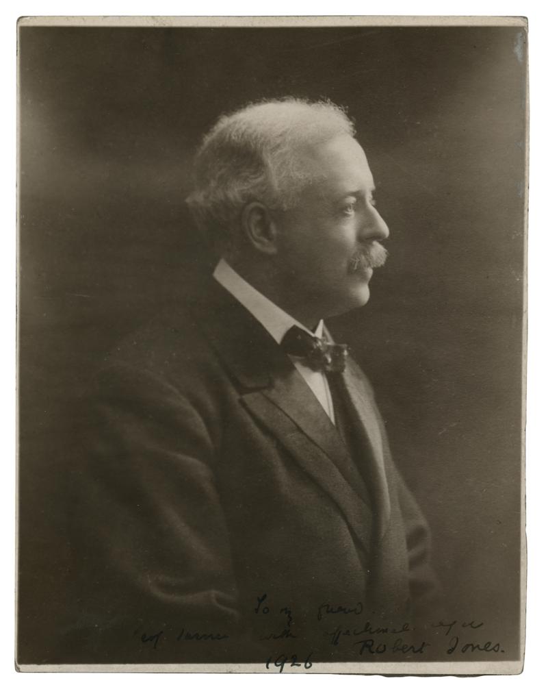 Welsh orthopedic surgeon (1857-1933) who helped to establish the modern specialty of orthopedic surgery in Britain and pioneered the use of X-rays in his practice. Vintage matte-finish 6 x 7.75 photo of Jones in near-profile, signed and inscribed at the bottom of the image in ink and dated 1926. Affixed to a same-size mount and in fine condition, with trimmed edges.