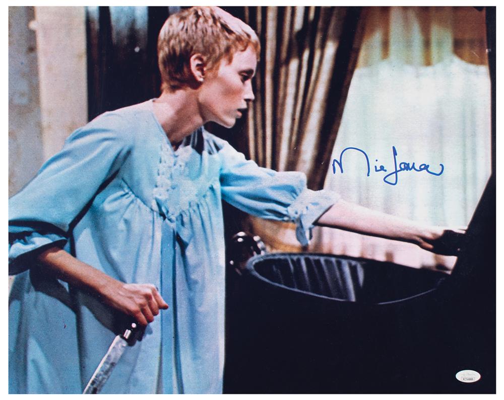 Large color satin-finish 20 x 16 photo of Mia Farrow as new mother Rosemary Woodhouse looking at her child for the first time in the classic 1968 horror film Rosemary's Baby, signed in blue felt tip. In very fine condition, with somewhat grainy image quality and a JSA label affixed to the lower right corner. Accompanied by a certificate of authenticity from JSA.