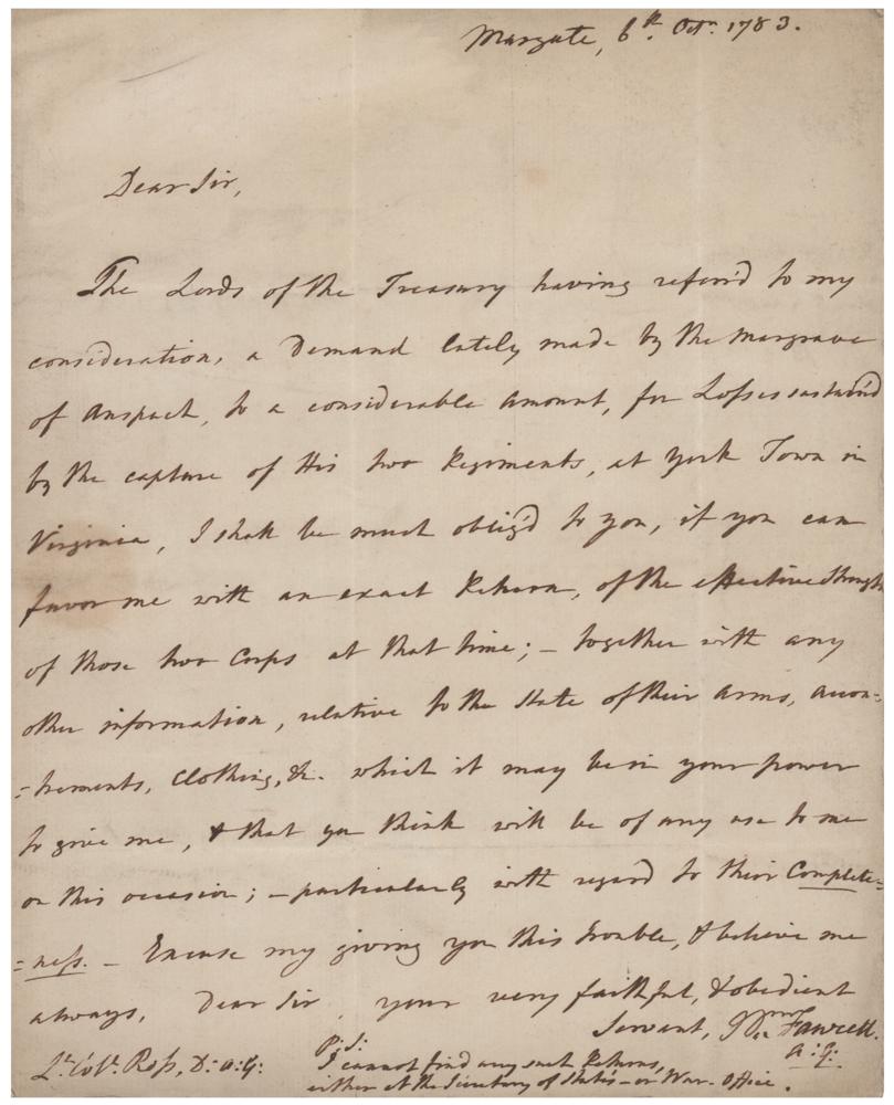 British Army officer (1727-1804) who served as Adjutant-General to the Forces from 1781 to 1799. ALS signed “Wm. Fawcett, A: G:,” one page, 7.5 x 9.5, October 6, 1783. Handwritten letter to "Lieut. Col. Ross, Deputy Adj't Gen'l at Edinburgh," with Revolutionary War-related content. In full: "The Lords of the Treasury having referr'd to my consideration, a demand lately made by Margrave of Ansbach, to a considerable amount, for Losses sustained by the capture of his foot regiments, at York Town in Virginia, I shall be much obliged to you, if you can favor me with an exact Return…together with any other information, relative to the state of their arms, accouterments, clothing, &c. which it may be in your power to give me." Addressed on the integral leaf in Fawcett's hand, and franked in the lower left, "Wm. Fawcett, Adju't Gen'l." In fine condition, with small seal-related loss and a rusty circular paperclip impression to the top. Alexander, Margrave of Brandenburg-Ansbach, earned income from hiring auxiliary troops to King George III for the American Revolutionary War. Approximately one quarter of the forces who surrendered at Yorktown were the Margrave's German troops.
