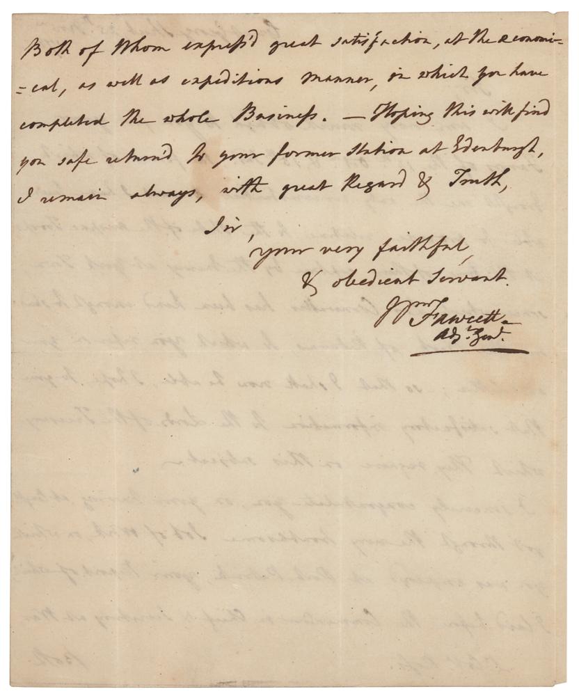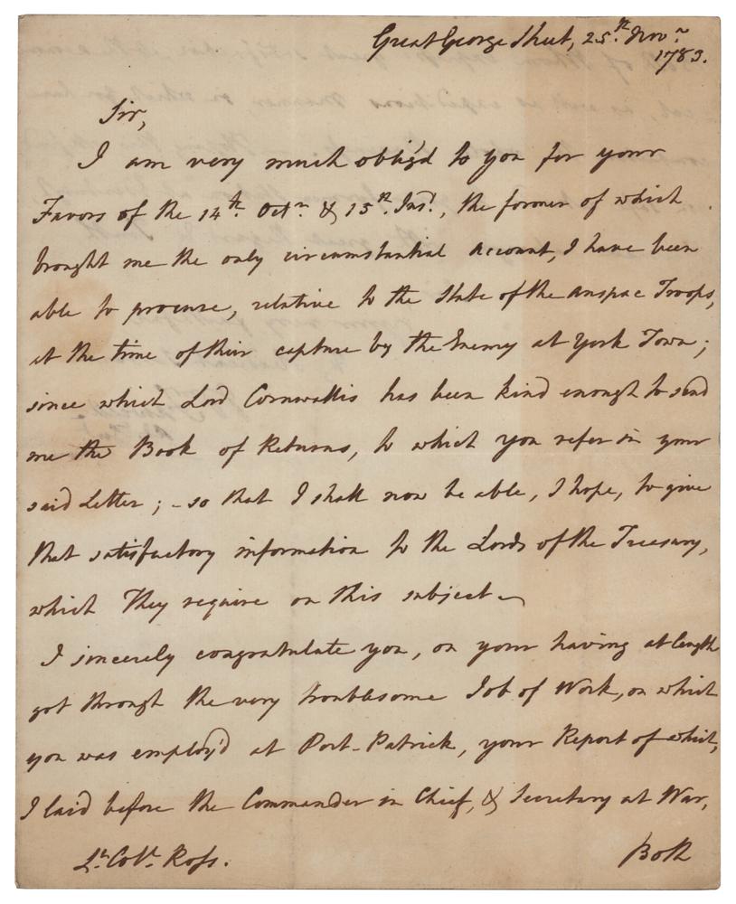 British Army officer (1727-1804) who served as Adjutant-General to the Forces from 1781 to 1799. ALS signed “Wm. Fawcett, Adj't Gen'l,” one page both sides, 7.5 x 9.5, November 25, 1783. Handwritten letter to "Lt. Col. Ross," with Revolutionary War-related content. In part: "I am very much obliged to you for your Favors?which brought me the only circumstantial account, I have been able to procure, relative to the state of the Ansbach Troops, at the time of their capture by the Enemy at York Town; since which Lord Cornwallis has been kind enough to send me the Book of Returns, to which you refer in your said Letter." In fine condition. Alexander, Margrave of Brandenburg-Ansbach, earned income from hiring auxiliary troops to King George III for the American Revolutionary War. Approximately one quarter of the forces who surrendered at Yorktown were the Margrave's German troops. Fawcett had requested information concerning the losses sustained by these troops, as the Margrave had made a considerable demand for reimbursement.