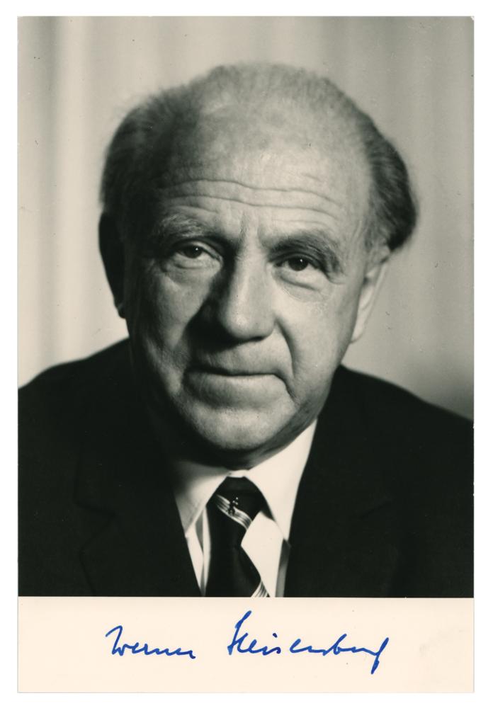 German theoretical physicist (1901-1976) awarded the 1932 Nobel Prize in physics for the creation of quantum mechanics. Uncommon matte-finish 4.25 x 6.5 photo of Heisenberg, signed in the lower border in blue ink. In very fine condition.