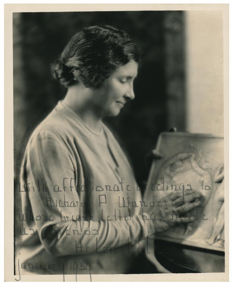 Exquisite vintage matte-finish 8 x 10 photo of Keller touching a relief sculpture tile, signed and inscribed in pencil, "With affectionate greetings to Richard P. Wunder, whose bright letter has made us friends, Helen Keller, January 1939.” In fine to very fine condition.