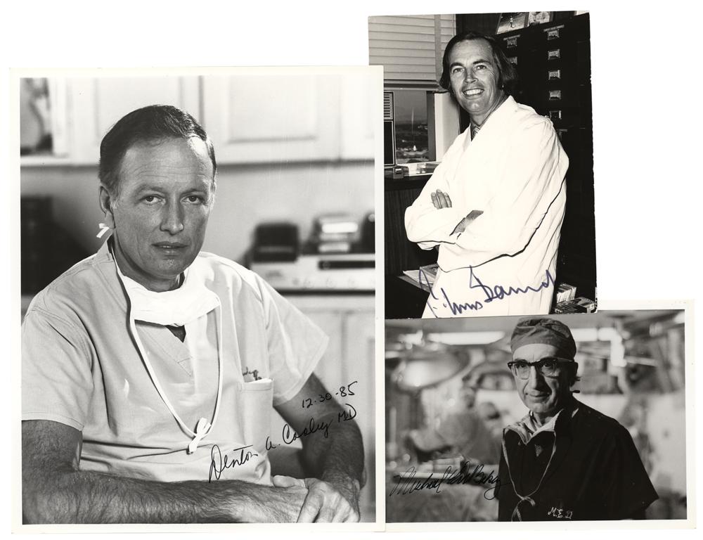 Three photos signed by important cardiac surgeons, including: a glossy 7 x 5 photo of Michael DeBakey, signed in black felt tip; a matte-finish 4.75 x 6.5 photo of Christaan Barnard, signed in black felt tip; and a glossy 8 x 10 photo of Denton A. Cooley, signed in black felt tip. In overall fine condition.
