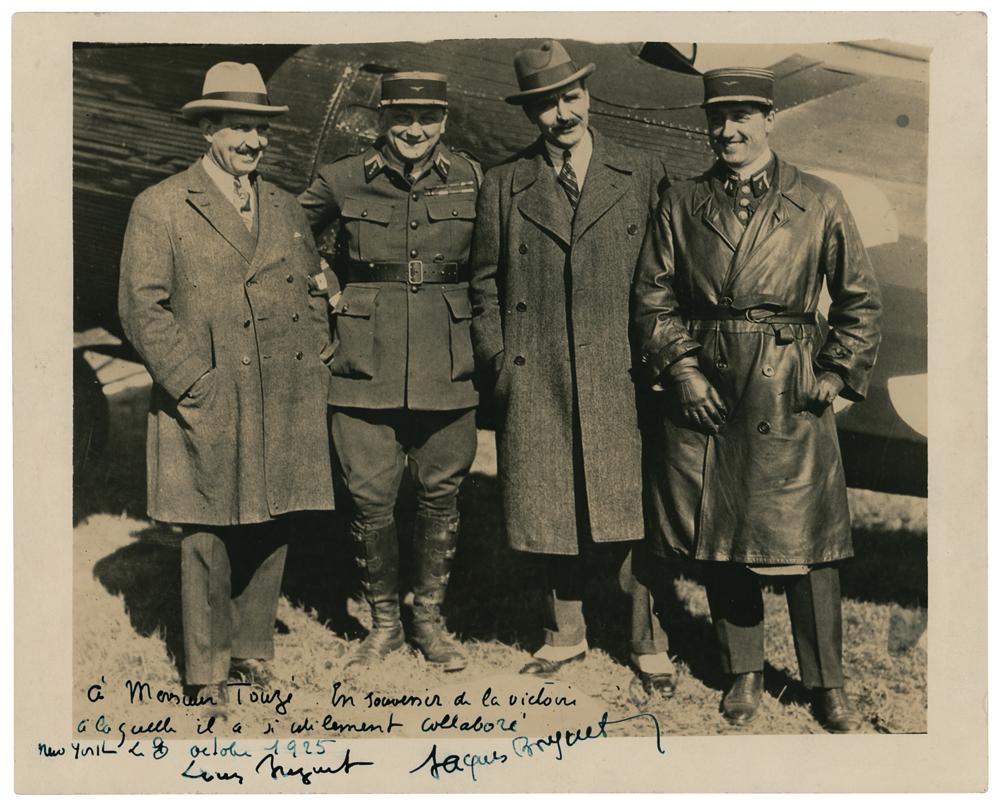 Early French aircraft designers and builders. Vintage matte-finish 10 x 8 photo of the French aviation pioneers posing in front of an aircraft with military aviators, signed and inscribed in fountain pen in the lower border by Louis and Jacques Breguet, and dated at New York, October 1925. In very fine condition.