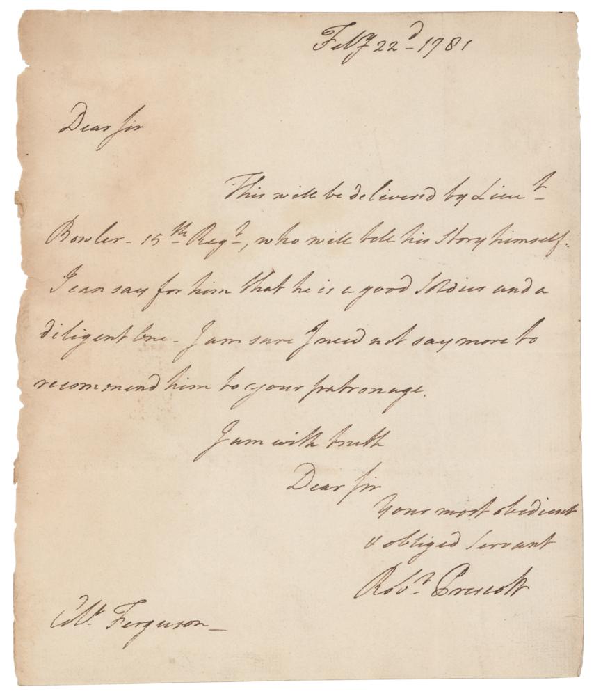 British military officer (1726-1815) who participated in the Seven Years' War, the French and Indian War, and the American Revolutionary War; in the Revolution, he was present at the Battle of Long Island, the Battle of Fort Washington, and the Battle of Brandywine. Revolutionary War-dated ALS signed “Rob't Prescott,” one page, 7.5 x 8.75, February 22, 1781. Handwritten letter to "Colo. Ferguson," in part: "This will be delivered by Lieut. Bowler, 15th Reg't, who will tell his story himself. I can say for him that he is a good soldier and a diligent one. I am sure I need not say more to recommend him to your patronage." In fine condition.