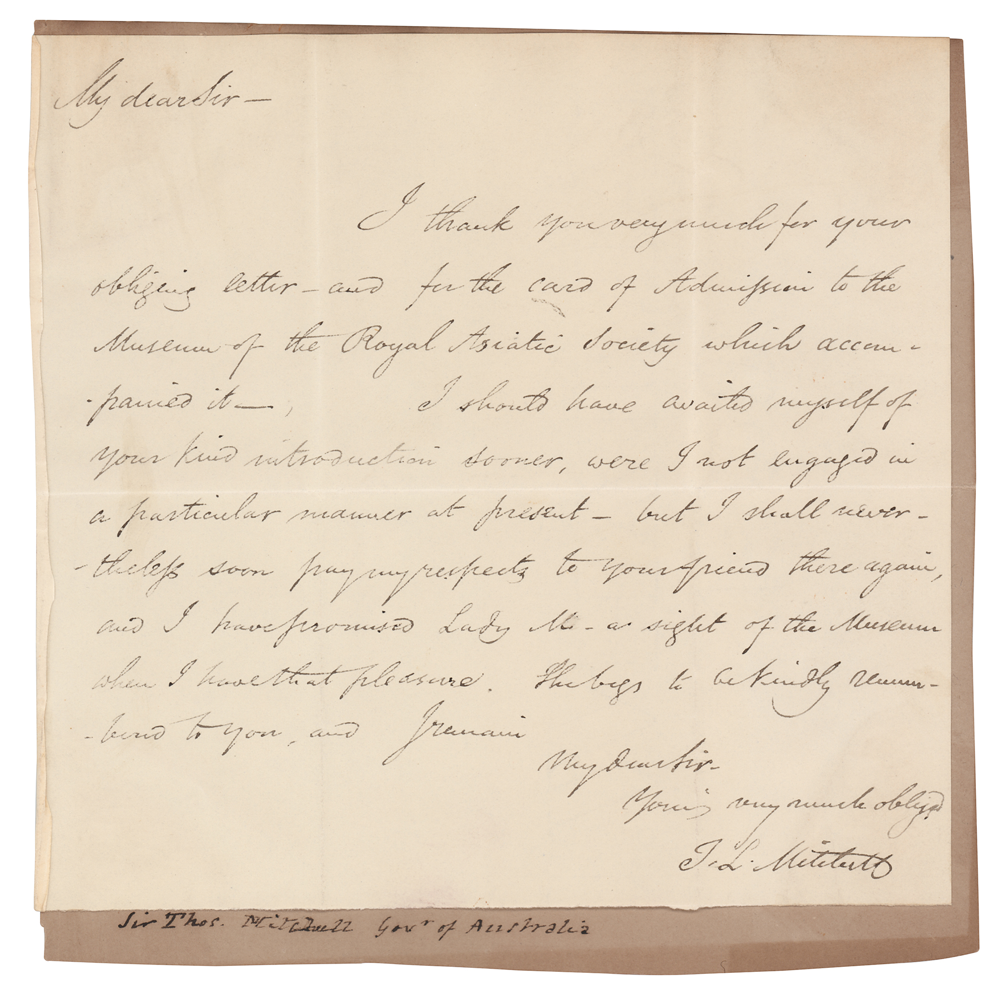 Important surveyor, mapmaker, and explorer of Southeastern Australia (1792-1855) who served as Surveyor General of New South Wales from 1828 until his death. Scarce ALS signed “T. L. Mitchell,” one page, 6.75 x 6.5, no date. Handwritten letter, in part: "I thank you very much for your obliging letter—and for the card of Admission to the Museum of the Royal Asiatic Society which accompanied it?I have promised Lady M. a sight of the Museum when I have that pleasure." Affixed to a slightly larger sheet and in fine condition.