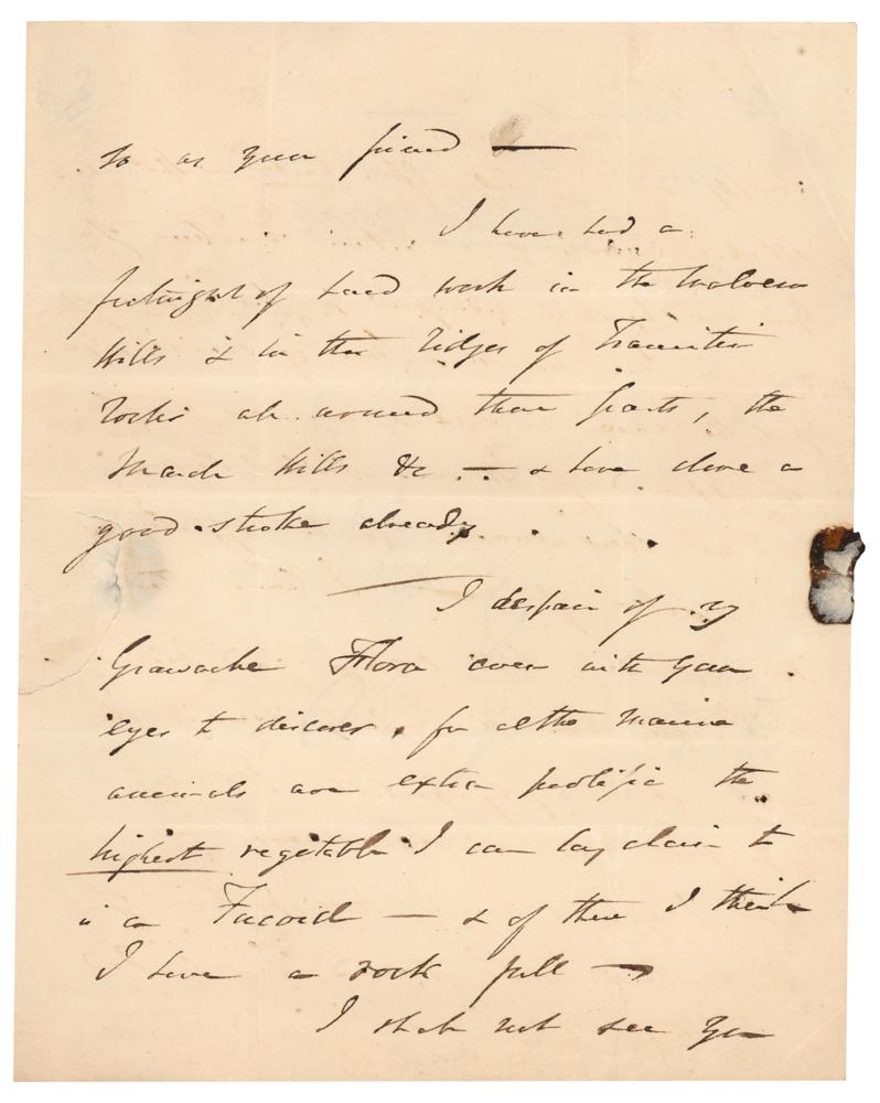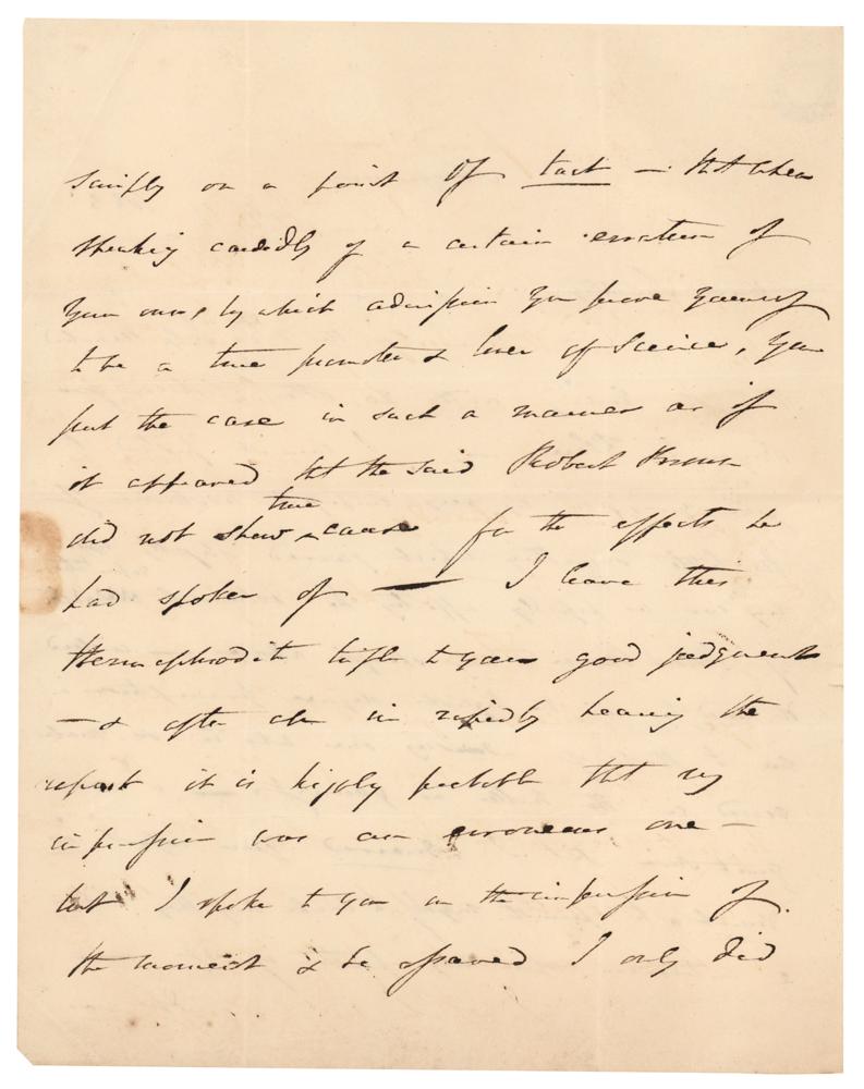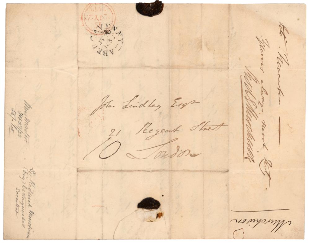 Scottish geologist (1792-1871) who was the first to investigate the Silurian system. ALS signed “Rod. I. Murchison,” four pages on two adjoining sheets, 7.5 x 9.5, July 19, 1833. Handwritten letter to botanist John Lindley, referring to the important Scottish botanist and pioneer of microscopy Robert Brown, who observed what is now known as 'Brownian motion' in 1827, and named the cell nucleus in 1833. In part: "I cannot pretend to give you from my very imperfect recollection of the little something which jarred slightly upon my ear as possibly affecting the botanical reputation of Robert Brown, any specific advice?you put the case in such a manner as if it appeared that the said Robert Brown did not show true cause for the effects he had spoken of—I leave this?to your good judgment." In fine condition, with creasing to corners and a seal-related tear.