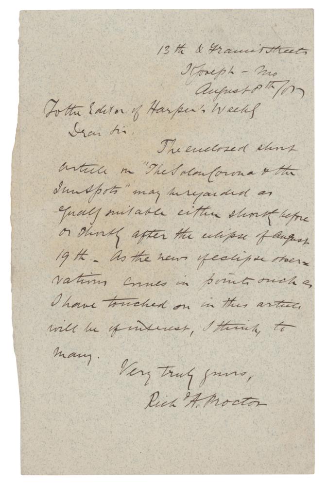 British astronomer (1837-1888) best remembered for having produced one of the earliest maps of Mars in 1867. ALS signed “Richard A. Proctor,” one page, 4.5 x 7, August 8, 1887. Handwritten letter to "the Editor of Harper's Weekly," in full: "The enclosed short article on 'The Solar Corona & the Sun Spots' may be regarded as equally suitable either shortly before or shortly after the eclipse of August 19th. As the news of eclipse observations comes in points such as I have touched on in this article will be of interest, I think, to many." In fine condition. This total solar eclipse was visible across Europe, Asia, and Japan.