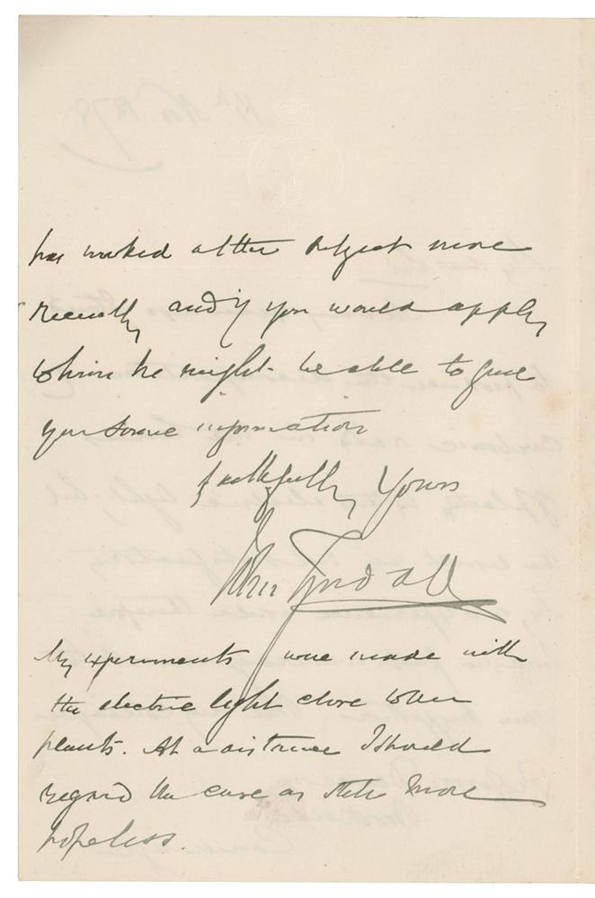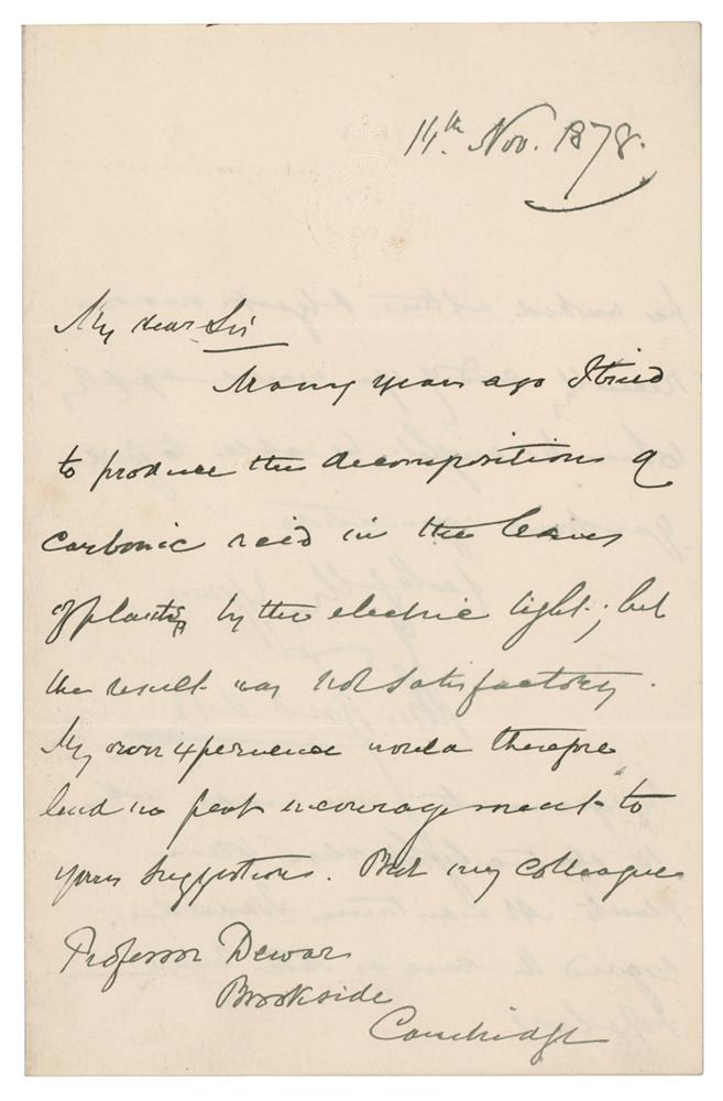 Irish physicist (1820-1893) known for his study of diamagnetism and his realms of infrared radiation and the physical properties of air. ALS, one page both sides, 4.5 x 7, November 14, 1878. Handwritten letter referencing noted physicist James Dewar, in part: "Many years ago I tried to produce the decomposition of carbonic acid in the leaves of plants by the electric light, but the result was not satisfactory? But my colleague, Professor Dewar, Brookside, Cambridge, has worked on the object more recently and if you would apply to him he might be able to give you some information." In fine condition.