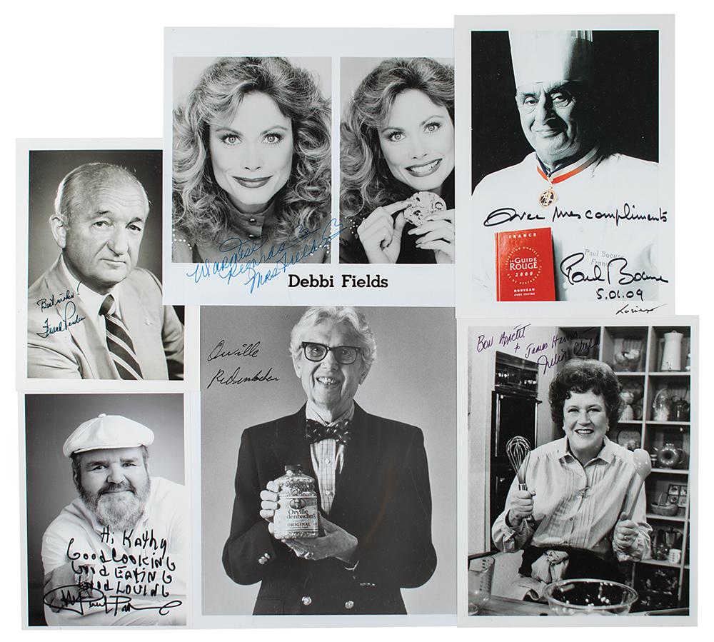 Group of six photos of culinary captains of industry, ranging in size from 5 x 7 to 8 x 10, each signed in ink by the savory subject. Signers are: Julia Child, Frank Perdue, Paul Prudhomme, Paul Bocuse, Debbi Fields, and Orville Redenbacher. In overall fine condition.