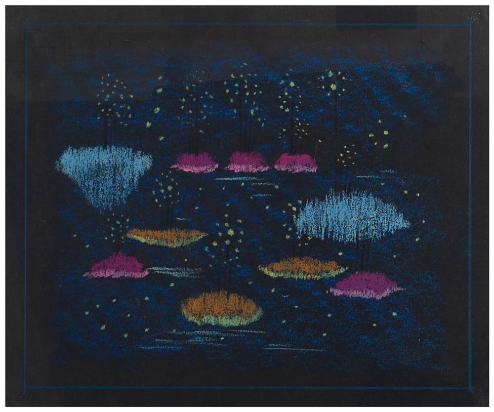(Walt Disney Studios, 1940) Striking original production concept storyboard painting featuring the Russian Thistle Dancers from the Tchaikovsky 'Nutcracker' sequence of Fantasia. Accomplished in color pastels on 12 x 10 black paper. In fine condition, with pinholes to corners.