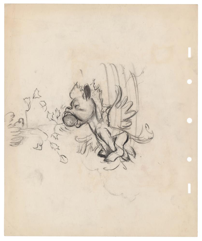 (Walt Disney Studios, 1940) Well-done original concept drawing featuring Baby Pegasus from the 'Pastoral Symphony' segment of Fantasia, showing the playful young Pegasus chomping on an apple. Accomplished in graphite on untrimmed 12 x 10 animation paper. Image measures 5.75 x 7.25. In fine condition.