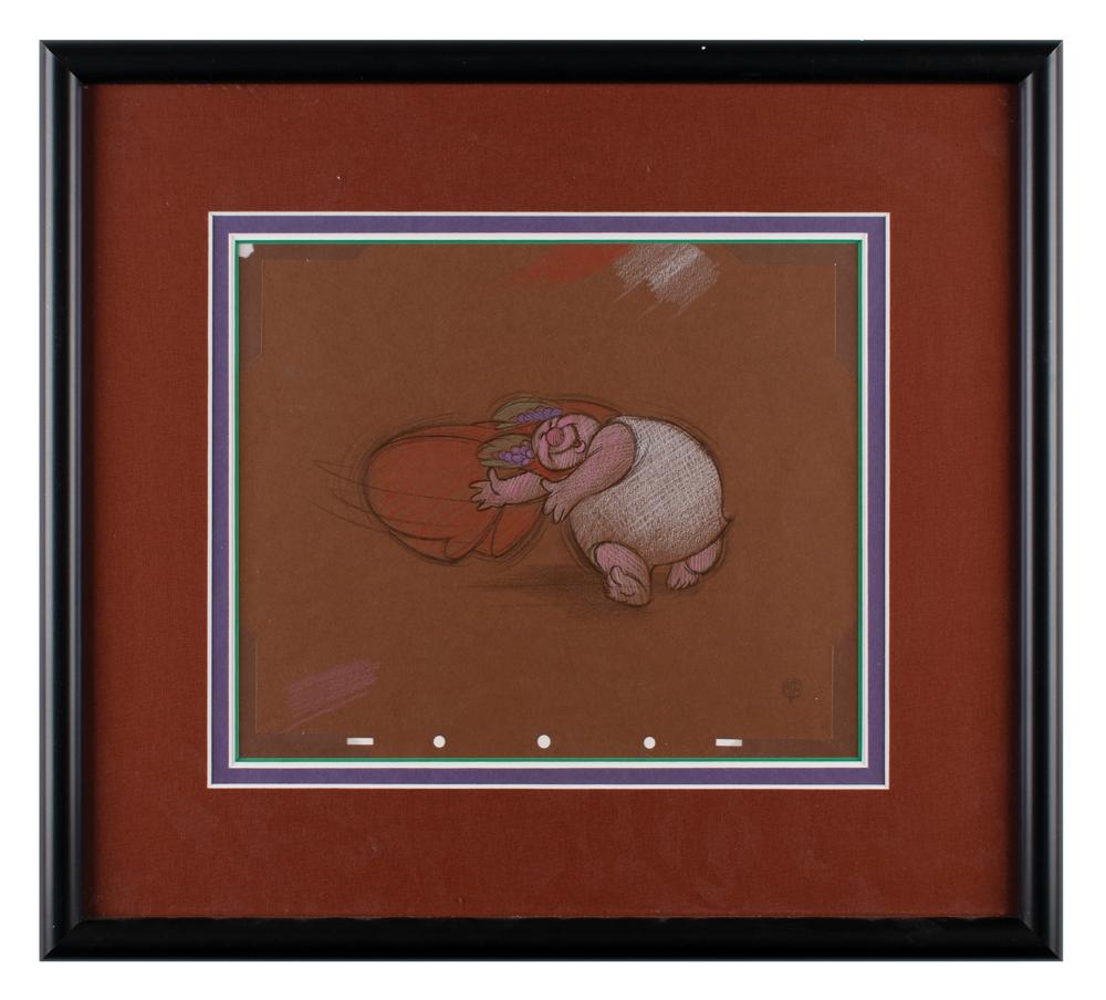 (Walt Disney Studios, 1940) Original concept production storyboard drawing of Bacchus from Fantasia, which depicts the jovial wine-loving character from the film's 'Pastoral Symphony' segment. Accomplished in charcoal and colored pastel on 11.75 x 9.75 animation paper, which bears the "WDP" stamp to lower right corner. Character images measure 7 x 4. Archivally triple-matted and framed to an overall size of 19.5 x 17.5. In fine condition, with a chip to the upper left corner.