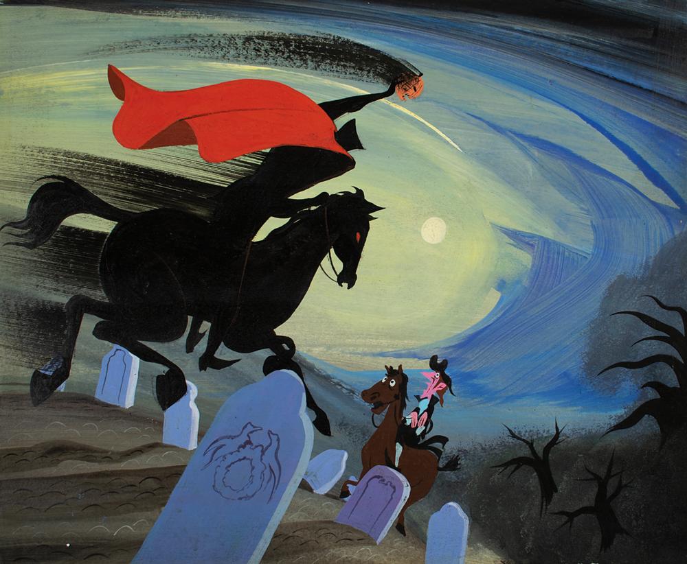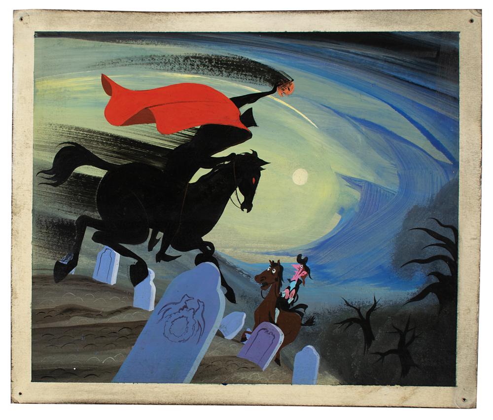 (Walt Disney Studios, 1949) Marvelous original concept painting by Mary Blair for The Legend of Sleepy Hollow, showing the Headless Horseman confronting the Ichabod Crane in a graveyard under a full moon. Blair excels in this skillfully rendered, well-composed scene: riding astride his stark black horse, the Headless Horsemen is given a sense of violent motion while Ichabod is paralyzed by fear. Accomplished in tempera on 11 x 9.25 artist's board. In fine condition, with tack holes to corners.