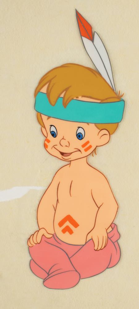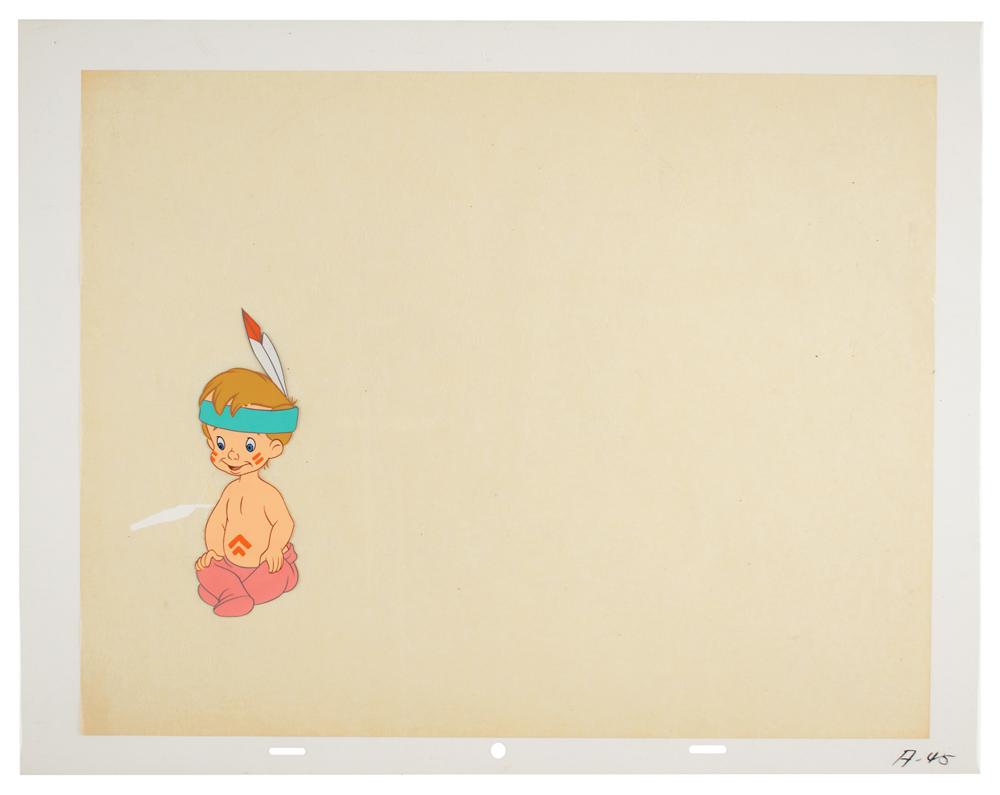 (Walt Disney Studios, 1953) Original production cel featuring Michael Darling from Peter Pan, showing the child dressed as an Indian brave. Image measures 1.75 x 5, with overall dimensions of 16 x 12.5. In fine condition with a tiny chip to his hairline.