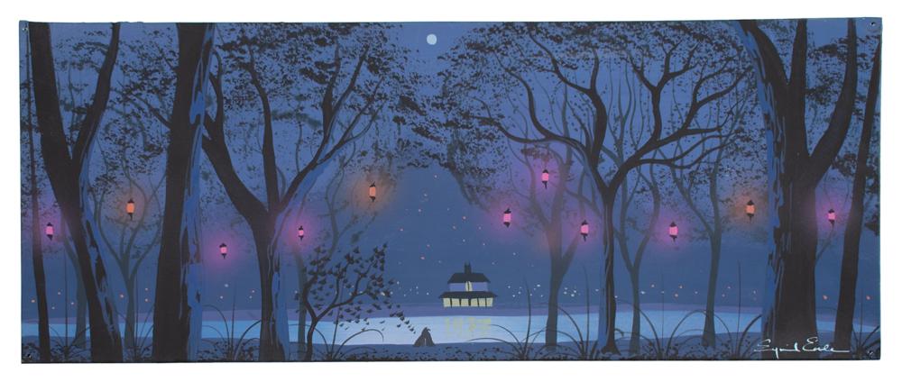 (Walt Disney Studios, 1955) Lovely original panorama concept storyboard painting by Eyvind Earle from Lady and the Tramp, showing the title canines in a romantic park scene as part of the 'Bella Notte' night. With his expert use of color and space, Earle fills the scene magically, making the night come alive above and around the small silhouettes that embrace at the lake’s edge. Gentle light works wonders here, as multicolored lanterns hang dreamily from branches, windows from a house across the water cast their glow, and, like a spotlight on high, the moon sits solemnly between canopies, its soft radiance touching everything below. Accomplished in tempera on 15.5 x 6.25 artist's board, signed in the lower right corner in paint, "Eyvind Earle." In fine condition, with tack holes to corners. Disney artist Eyvind Earle, who later became Sleeping Beauty's production designer, created almost 50 miniature concept sketches for the 'Bella Notte' sequence and was a key contributor to the classic film.