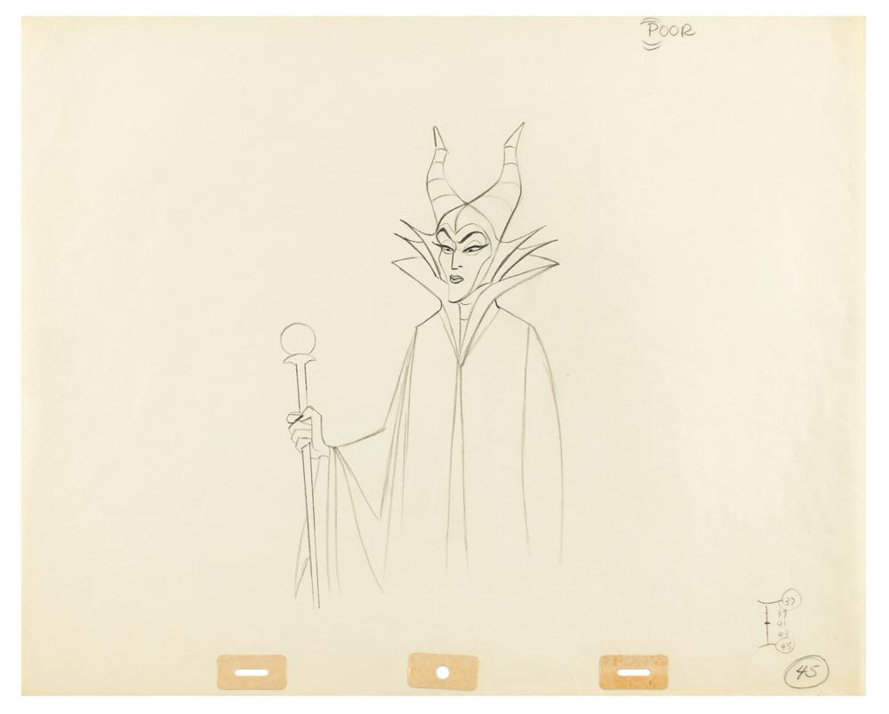 (Walt Disney Studios, 1959) Original production drawing of Maleficent from Sleeping Beauty, showing the evil sorceress, her scepter in hand, in an entirely displeased half-length pose. Accomplished in graphite on untrimmed 15.5 x 12.5 animation paper, which is marked "45" in the lower right. The character image measures an impressive 5 x 8.25. In fine condition.