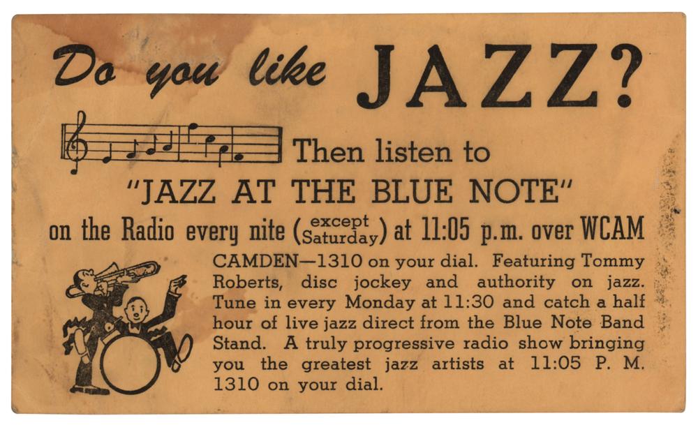 Ink signature and inscription, "Best of everything to Pancho, From Art Blakey, Drums,” on an off-white 3.25 x 5.5 card bearing a sketch of Blakey in an unknown hand. In fine condition, with some creasing to the top edge.