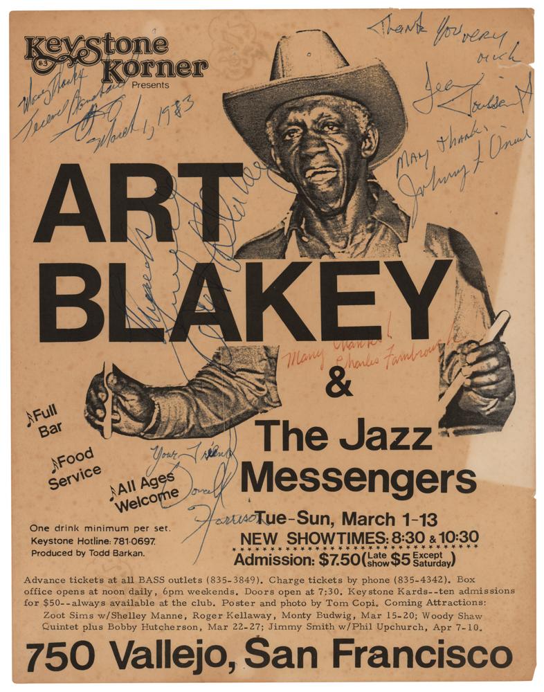 Vintage handbill for a series of concerts by Art Blakey and The Jazz Messengers at the Keystone Korner jazz club in San Francisco, between March 1 and 13, [1983], 8.5 x 11, signed in ballpoint, “Thanks, sincerely, Art Blakey.” The handbill is also signed by Terence Blanchard, Charles Fambrough, Donald Harrison, Johnny O'Neal, and Jean Toussaint. In very good to fine condition, with irregular toning, a tear to the upper right corner, and several tack holes to the top.