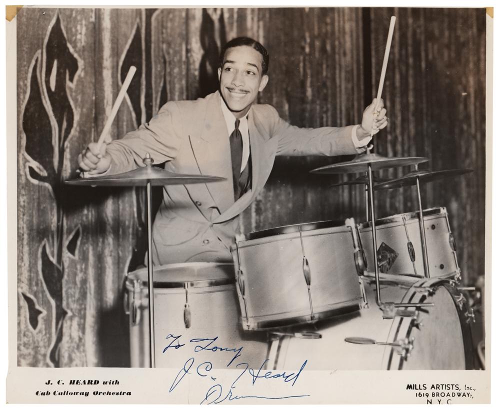 American swing, bop, and blues drummer (1917-1988) who, besides leading his own groups, played with notable musicians like Lena Horne, Coleman Hawkins, Dexter Gordon, Benny Carter, Cab Calloway, Charlie Parker, Dizzy Gillespie, and Roy Eldridge. Vintage glossy 9.5 x 7.75 publicity photo of Heard playing drums with the Cab Calloway Orchestra, signed and inscribed in fountain pen, "To Tony, J. C. Heard, Drums.” In very good to fine condition, with trimmed borders, old tape to the upper corner tips, and a vertical crease at the bottom which passes through the first letter of the signature.