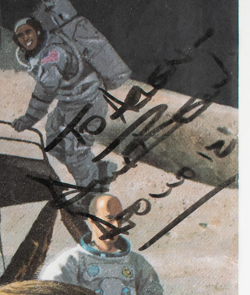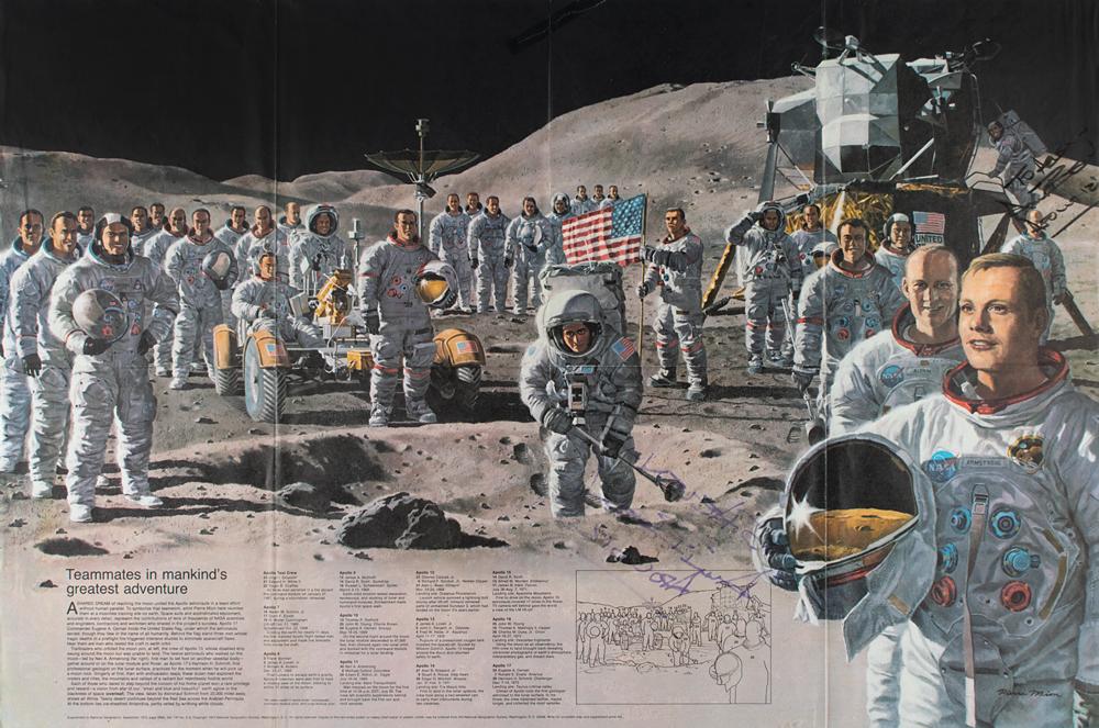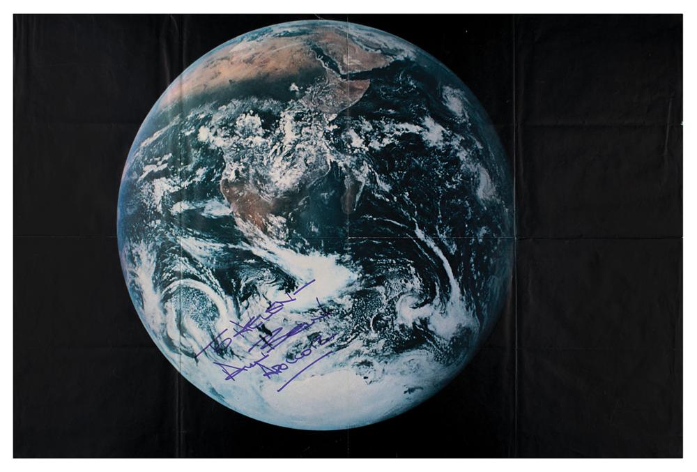 Color 34 x 22.5 paperstock poster of planet Earth as seen from outer space, signed and inscribed in purple felt tip, "To Helen—Alan Bean, Apollo 12." Bean has also signed the reverse side in black felt tip in the same manner. In very good to fine condition, with intersecting folds as issued, and a tear to the top edge repaired with old clear tape.