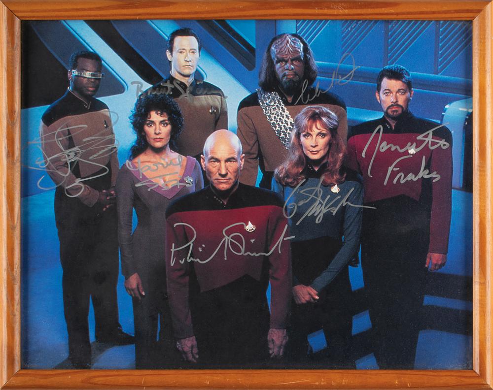 Color satin-finish 13.5 x 10.75 photo of the cast of Star Trek: The Next Generation, signed in silver ink by Patrick Stewart, Gates McFadden, Michael Dorn, LeVar Burton, Marina Sirtis, Brent Spiner, and Jonathan Frakes. Framed and in fine condition.