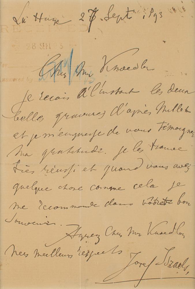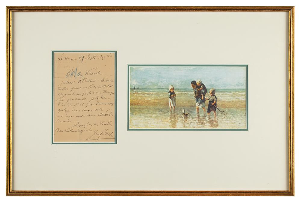 Dutch painter (1824-1911) who was a leading member of the group of landscape painters referred to as the Hague School and, during his lifetime, was deemed 'the most respected Dutch artist of the second half of the nineteenth century.' Rare untranslated ALS in French, one page, 4.25 x 6.25, September 27, 1893. A handwritten letter addressed from the Hague. Nicely double-matted and framed with a color reproduction of Israels' 1972 painting Les Enfants de la Mer (Children of the Sea) to an overall size of 20.5 x 30.5; frame backing bears three Goodspeed's Book Shop labels. In fine condition.