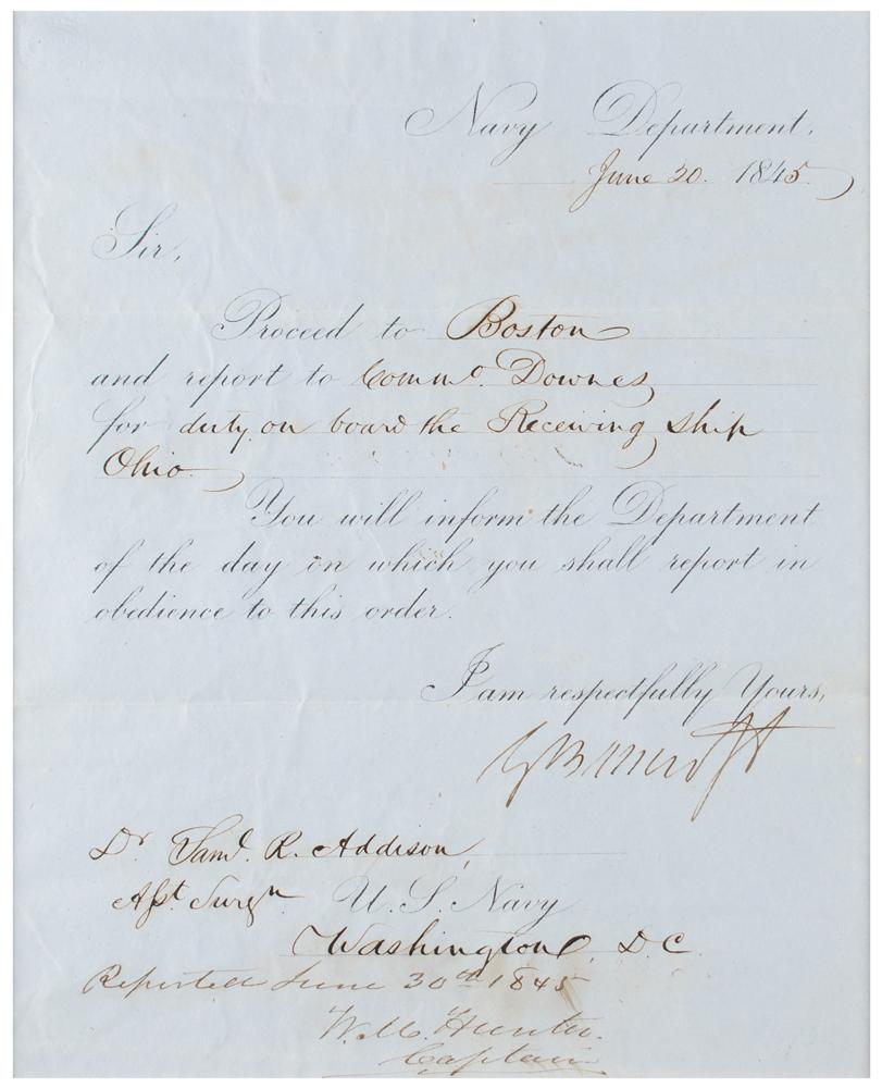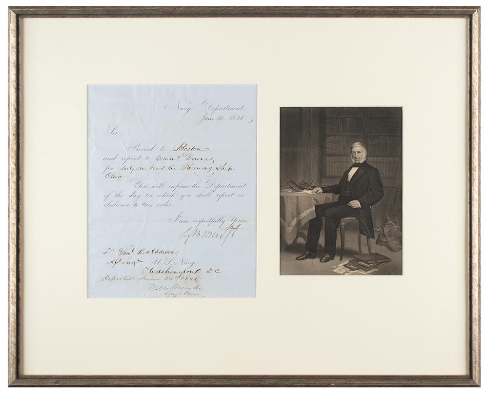 American historian, Secretary of the Navy, and diplomat (1813-1871) who established the United States Naval Academy at Annapolis. Partly-printed DS, signed “G. Bancroft,” one page, 7.5 x 9.5, June 30, 1845. Navy Department orders to Dr. Samuel R. Addison, assistant surgeon in the US Navy, in part: "Proceed to Boston and report to Conno. Downes for duty on board the Receiving Ship Ohio." Signed at the conclusion by Secretary of the Navy Bancroft. Matted and framed with an engraved portrait to an overall size of 21 x 17; the frame's backing bears an affixed Goodspeed's Book Shop label. In very good condition, with overall creasing.