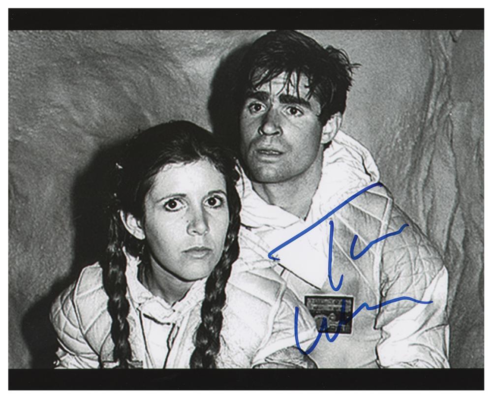 Satin-finish 10 x 8 photo of Carrie Fisher and Treat Williams on the set of The Empire Strikes Back, signed in blue felt tip by Williams. In very fine condition, with somewhat grainy image quality. Character actor Treat Williams visited the set of The Empire Strikes Back and ended up having an uncredited cameo as a Rebel Soldier during the indoor Echo Base scenes.