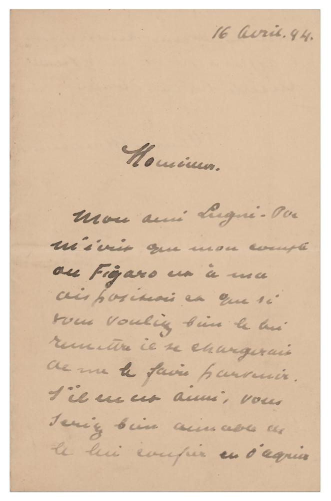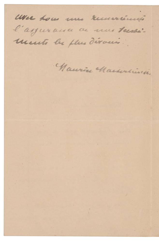 Belgian playwright, poet, and essayist (1862-1949) awarded the Nobel Prize in Literature in 1911. ALS in French, one page both sides, 4.5 x 7, April 16, 1894. Untranslated handwritten letter by Maeterlinck. In fine condition.