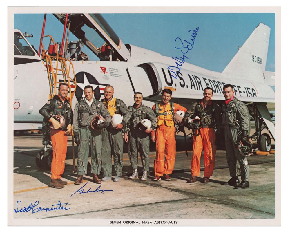 Official color 10 x 8 NASA lithograph of the original Mercury astronauts posing in front of a Convair F106-B aircraft at Langley Air Force Base on January 20, 1961, signed in blue felt tip by Scott Carpenter, Gordon Cooper, and Wally Schirra. In fine condition.