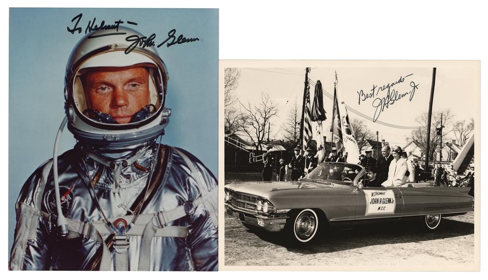 Two photos: a color semi-glossy 8 x 10 photo of Glenn in his Mercury space suit, signed and inscribed in black felt tip, "To Helmut-John Glenn"; and a vintage matte-finish 10 x 8 photo of Glenn and his wife Annie riding in a convertible following his successful Friendship 7 mission, signed in black ballpoint, "Best regards- J. H. Glenn, Jr.," with the reverse bearing an "Official Coast Guard Photograph" stamp. In overall fine condition, with some light surface creases to the color photo, and a short tear to the left edge to the other.