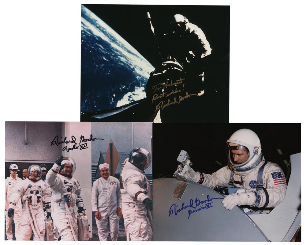 Three color 10 x 8 photos signed in felt tip by Richard Gordon, glossy and satin-finish, with one inscribed "To Helmut, Best wishes! Richard Gordon," and the other two signed "Richard Gordon, Gemini XI" and "Richard Gordon, Apollo XII." In overall fine condition.