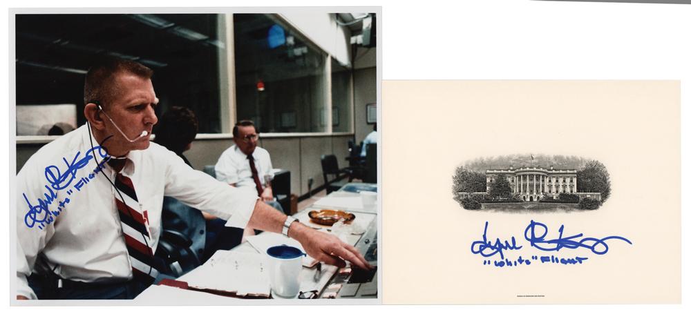 Two items signed in blue felt tip by Gene Kranz, “Eugene F. Kranz, ‘White’ Flight”—a color satin-finish 10 x 8 photo, and an 8 x 6 engraving of the White House from the Bureau of Engraving and Printing. In overall very fine condition.
