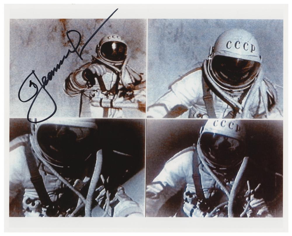 Color satin-finish 10 x 8 photo containing four images of Alexei Leonov conducting his historic first spacewalk, signed in black felt tip. In very fine condition.