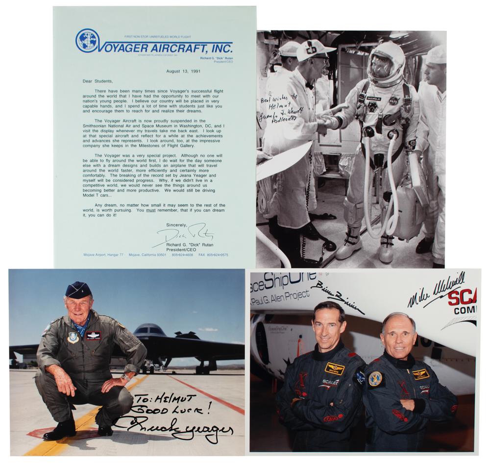 Four items signed in ballpoint or felt tip by a notable pilot or figure of space and aviation, including: Dick Rutan (TLS, 1991), SpaceShipOne (SP: Mike Melvill and Brian Binnie), Guenter Wendt (ISP), and Chuck Yeager (ISP). In overall fine condition.