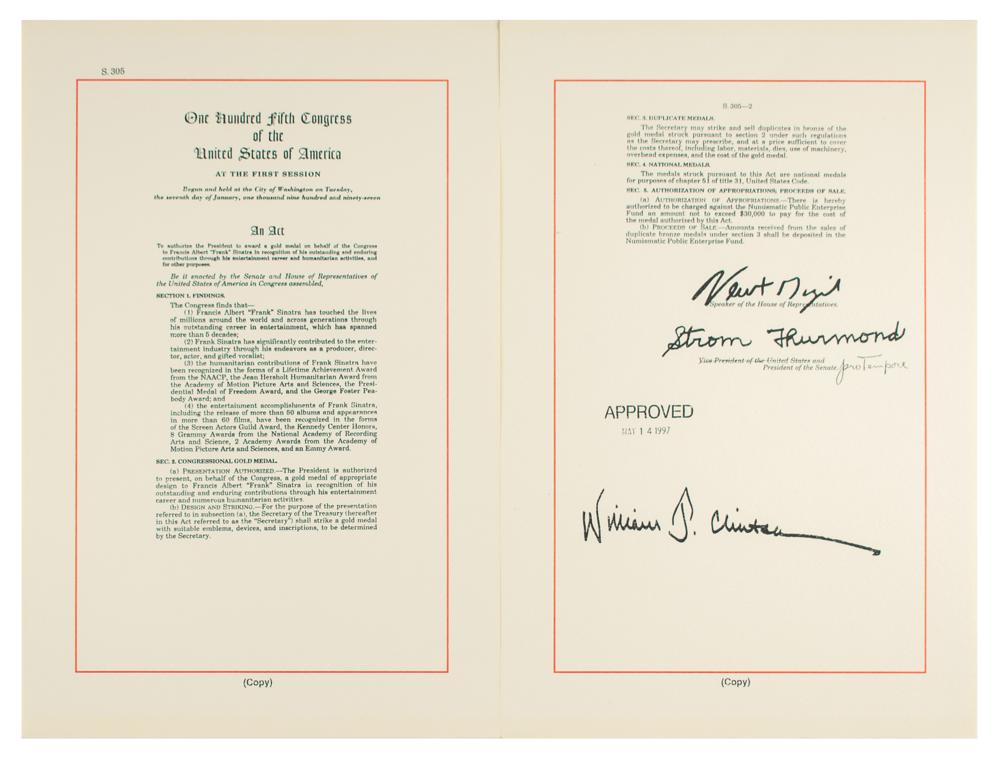 TLS as president, one page, 6.75 x 9, White House letterhead, June 10, 1997. Letter to Frank Sinatra, in part: "I was honored to sign into law the legislation authorizing the award of a Congressional Gold Medal to you. You have touched the lives of so many people over the years, not only through your spectacular career as a performer, but also through your many humanitarian activities. I hope you'll enjoy the enclosed commemorative copy of the legislation and the pen I used to sign it." Includes the souvenir copy of the legislation as well as the official black ballpoint bill signing pen that was used by Clinton, bearing Clinton's facsimile signature and the presidential seal. Everything in this lot was sent to Sinatra in 1997, a year before his passing. In very fine condition. Provenance: Lady Blue Eyes: Property of Barbara and Frank Sinatra, Sotheby's, 2018.