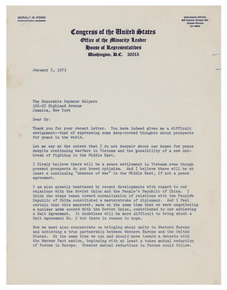TLS signed “Jerry Ford,” two pages, 8 x 10.5, Congress of the United States, Office of the Minority Leader letterhead, January 5, 1973. Letter to friend and former New York Congressman Seymour Halpern, in full: "Thank you for your recent letter. You have indeed given me a difficult assignment—that of expressing some deep-rooted thoughts about prospects for peace in the world. Let me say at the outset that I do not despair about our hopes for peace despite continuing warfare in Vietnam and the possibility of a new outbreak of fighting in the Middle East. I firmly believe there will be a peace settlement in Vietnam even though present prospects do not breed optimism. And I believe there will be at least a continuing 'absence of war' in the Middle East, if not a peace agreement.