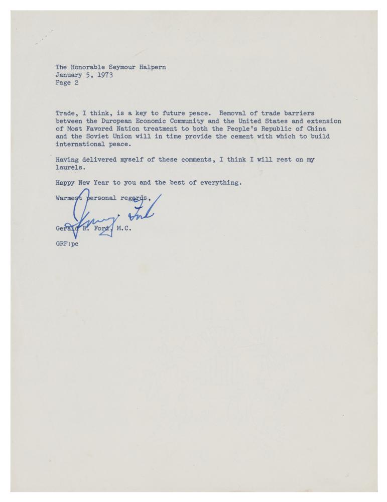 Trade, I think, is a key to future peace. Removal of trade barriers between the European [sic] Economic Community and the United States and extension of Most Favored Nation treatment to both the People's Republic of China and the Soviet Union will in time provide the cement with which to build international peace. Having delivered myself of these comments, I think I will rest on my laurels. Happy New Year to you and the best of everything." In fine condition, with some faint stains in the left margin of the first page. A hopeful, essentially prophetic letter from the future President of the United States; Ford would attain the vice presidency 11 months later with the resignation of Spiro Agnew, and then the presidency eight months after that with the exit of Richard Nixon.