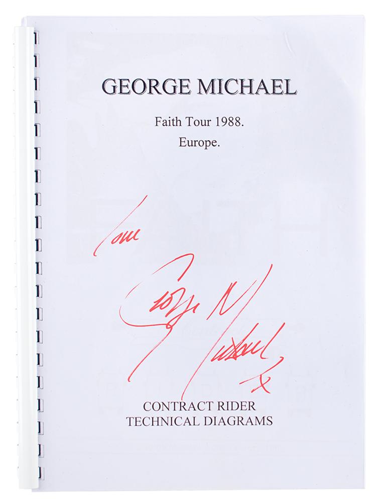 Spiral-bound contract rider and technical diagrams for the European leg of George Michael’s 1988 Faith Tour, 66 pages, 8.75 x 11.75, signed on the front cover in red paint pen, “Love, George Michael, x.” In fine condition, with some creasing to the plastic over the front cover.