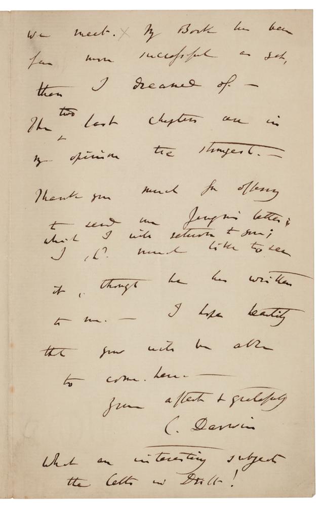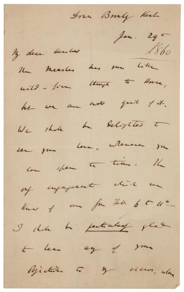 ALS signed “C. Darwin,” two pages on two adjoining sheets, 5 x 8, January 29, [1860]. Handwritten letter to his former teacher, John Stevens Henslow, in part: "The measles has gone like wild-fire through the house, but we are now quit of it. We shall be delighted to see you here, whenever you can spare the time?I shall be particularly glad to hear any of your objections to my views, when we meet. My Book has been far more successful as yet, than I dreamed of—The two last chapters are in my opinion the strongest." In fine condition.