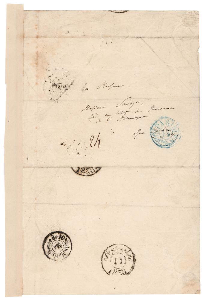 German naturalist and explorer (1769-1859) who wrote Kosmos, a massive five-volume study which attempted to unify the various branches of man's knowledge. ALS in German, one page, 5.25 x 8.25, no date. Handwritten letter to "Monsieur Savoye," care of the chief of the German Panorama, in part (translated): "The idea of the German Panorama is conceived with intelligence and artistically directed. Most kindly accept the expression of my most cordial thanks. It would be a pleasure to me to be able to repeat to you?how much I wish this noble undertaking godspeed." In very good to fine condition, with overall wrinkling, staining to edges, and a mounting strip to the left side.