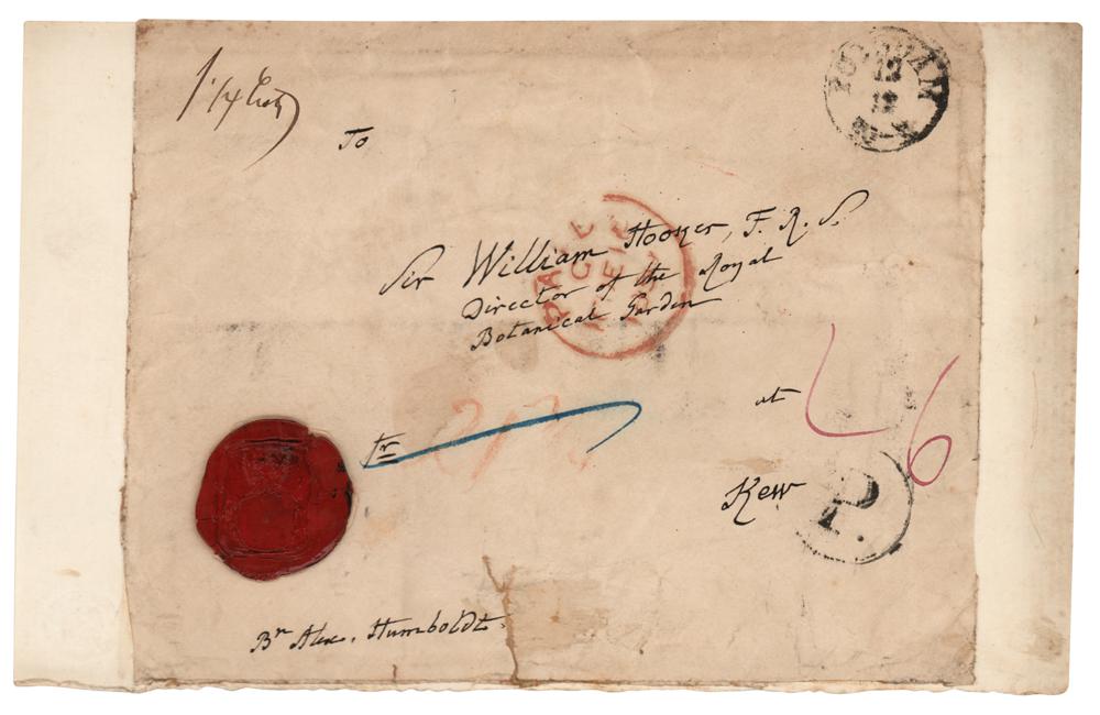 German naturalist and explorer (1769-1859) who wrote Kosmos, a massive five-volume study which attempted to unify the various branches of man's knowledge. Hand-addressed envelope panel, 5.75 x 4.5, addressed by Humboldt to William Jackson Hooker, "Sir William Hooker, F.R.S., Director of the Royal Botanical Garden at Kew," and signed in the lower left, "Br. Alex. Humboldt," with his red wax seal affixed above. Affixed to a slightly larger sheet and in very good to fine condition, with light soiling and a few edge tears. A nice association piece between scientists.