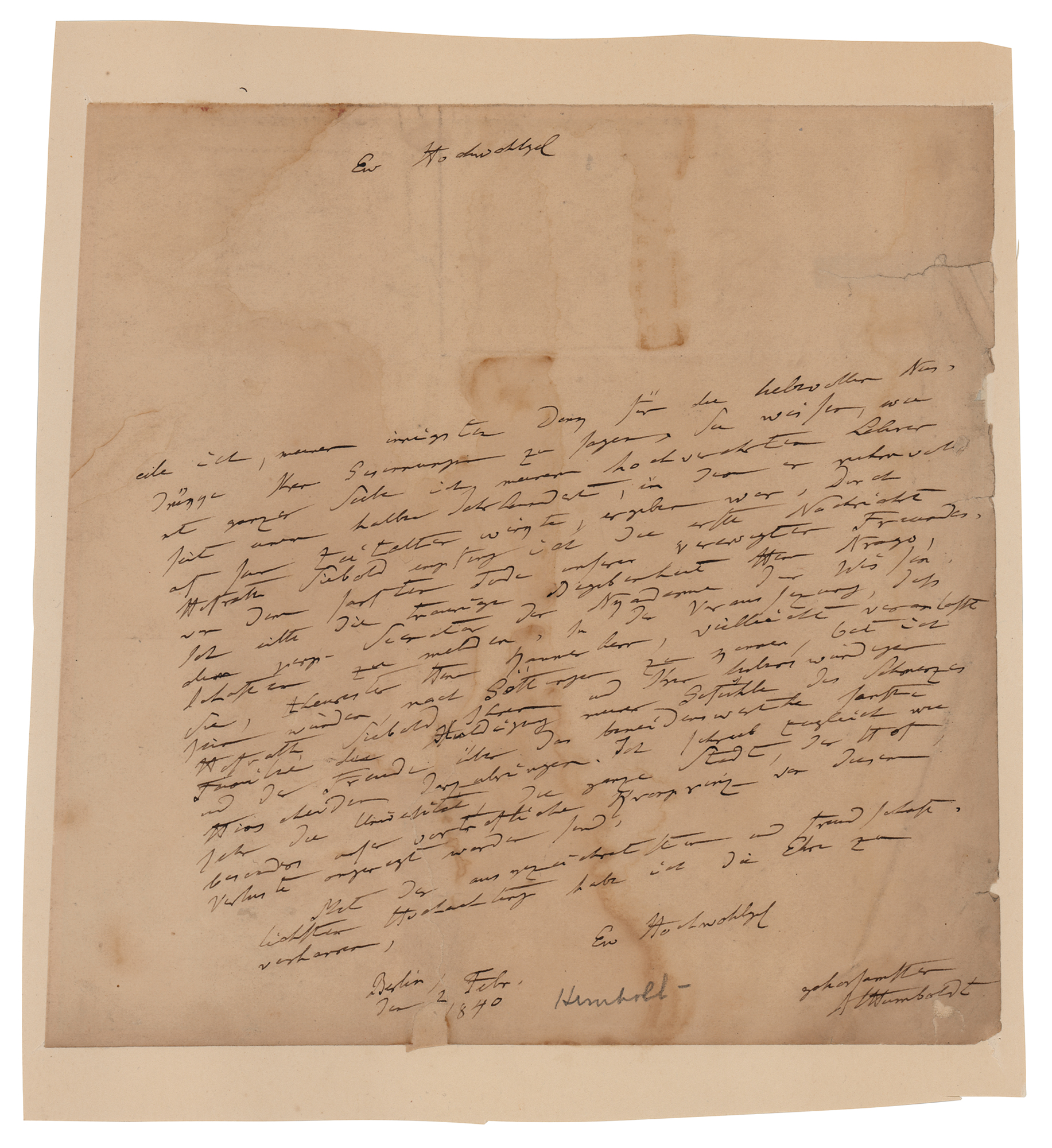 German naturalist and explorer (1769-1859) who wrote Kosmos, a massive five-volume study which attempted to unify the various branches of man's knowledge. ALS in German, signed “A. v. Humboldt,” one page, 7.25 x 7.5, February 2, 1840. Untranslated handwritten letter by the great naturalist. Professionally inlaid into a slightly larger sheet and in very good condition, with scattered staining and several small repaired edge tears.