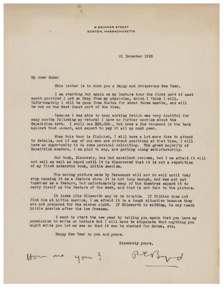 TLS signed “R. E. Byrd,” one page, 8.5 x 11, 9 Brimmer Street letterhead, December 31, 1935. Letter to Arthur A. Zuhn, a physicist with the Byrd Antarctic Expedition of 1933-35, in part: "I am starting out again on my lecture tour the first part of next month provided I get an Okay from my physician, which I think I will. Unfortunately I will be gone from Boston for about three months, and will be out on the West Coast part of the time. Because I was able to keep working (which was very doubtful for many months following my return) I have no further worries about the Expedition debt. I still owe $38,000, but have a few thousand in the bank against that amount, and expect to pay it all up next year. When this tour is finished, I will have a lot more time to attend to details, and if any of our men are without positions at that time, I will have an opportunity to do some personal soliciting. The great majority of Expedition members, I am glad to say, are getting along satisfactorily. Our book, Discovery, has had excellent reviews, but I am afraid it will not sell as well as hoped until it is discovered that it is not a repetition of my first Antarctic book, Little America." Byrd adds a brief handwritten postscript: "How are you?" In fine condition, with two small stains to the top edge.