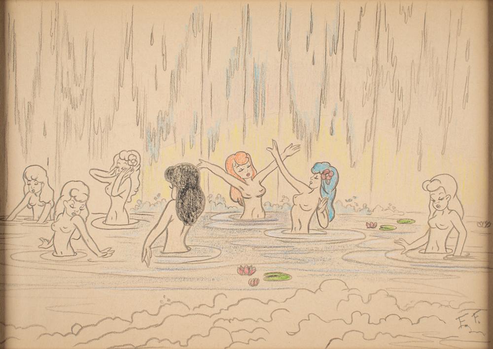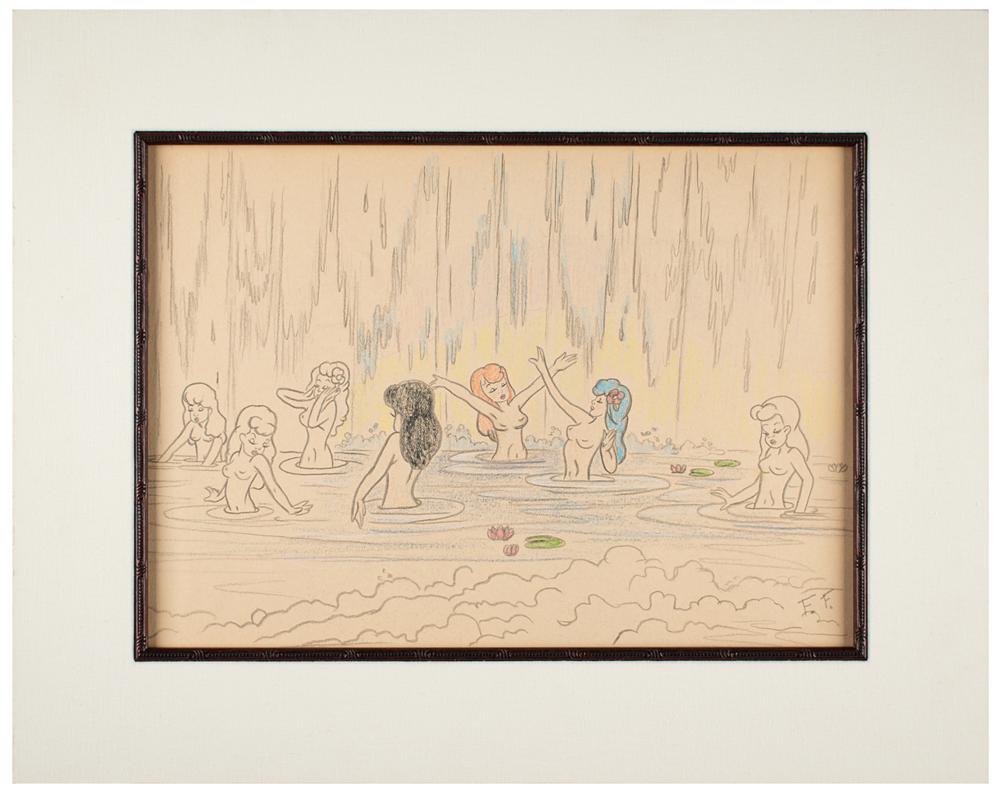 (Walt Disney Studios, 1940) Original panoramic color concept drawing by Frank Follmer for Fantasia, featuring seven topless Centaurettes bathing from the 'Pastoral Symphony' segment of the film. Accomplished in graphite and crayon on 15.5 x 11 artist's paper, signed in the lower right in pencil with his initials, "F. F." Matted to an overall size of 21.5 x 17. In fine condition. Follmer worked at Walt Disney Studios from the late 1930s through the early 1940s, assisting on projects like Snow White and the Seven Dwarfs, Pinocchio, and Fantasia. He alienated Walt Disney when he organized a strike against the studio, and ultimately left to join the Navy.