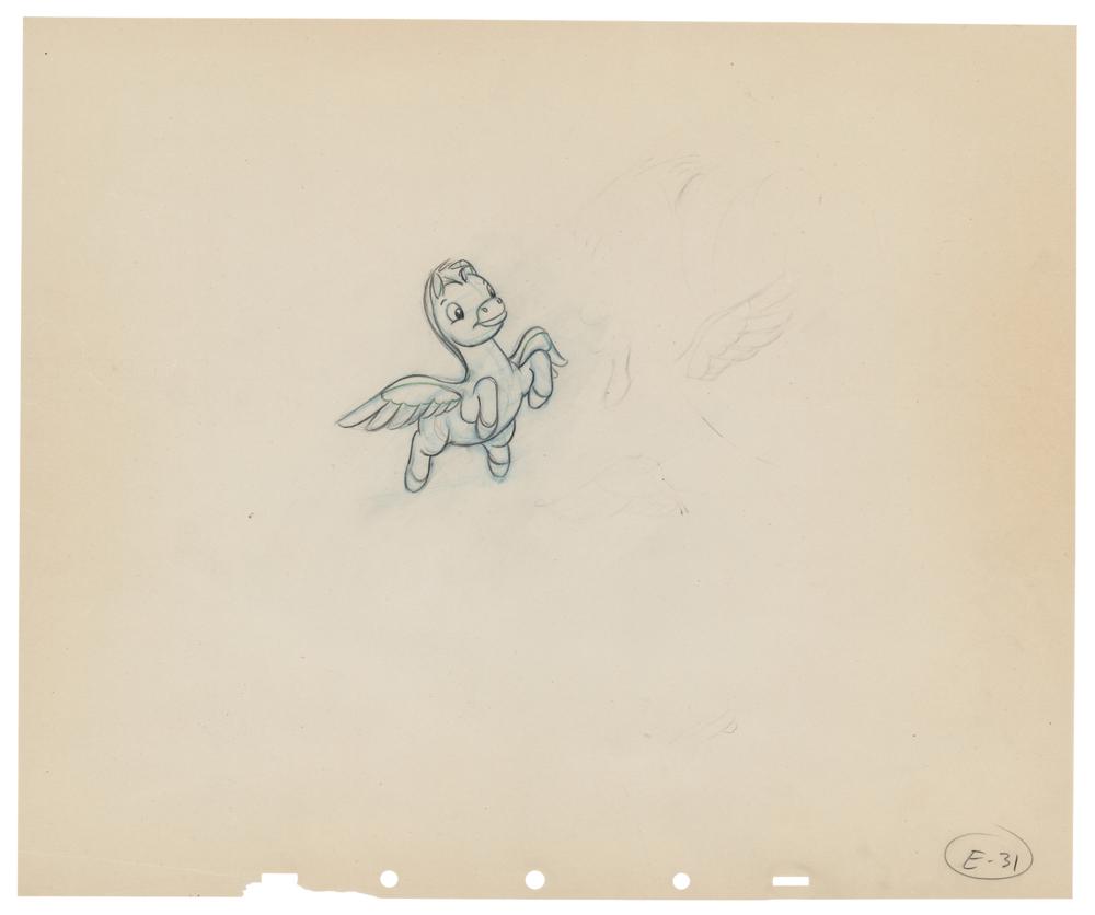 (Walt Disney Studios, 1940) Original production drawing featuring Baby Pegasus from the 'Pastoral Symphony' segment of Fantasia, showing the cute winged horse in a full-bodied pose. Accomplished in graphite and colored pencil on 14.5 x 12 animation paper, marked "E-31" in the lower corner. Image measures 3 x 3.25. In fine condition, with a chip to the bottom edge.