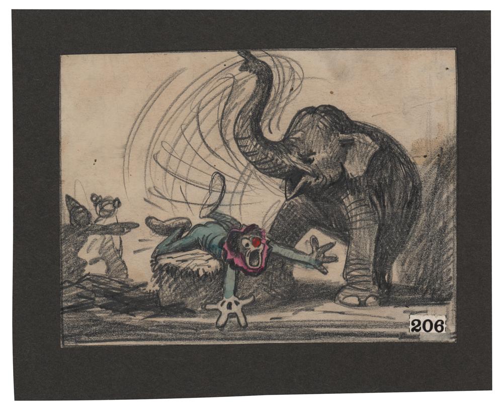 (Walt Disney Studios, 1941) Humorous original production storyboard drawing from Dumbo, showing Mrs. Jumbo spanking a clown with her trunk. Accomplished in graphite and colored pencil on a trimmed 6 x 4.5 off-white sheet, with a "206" label applied to the lower right corner. In fine condition. A detailed storyboard drawing from the popular and successful animated feature.